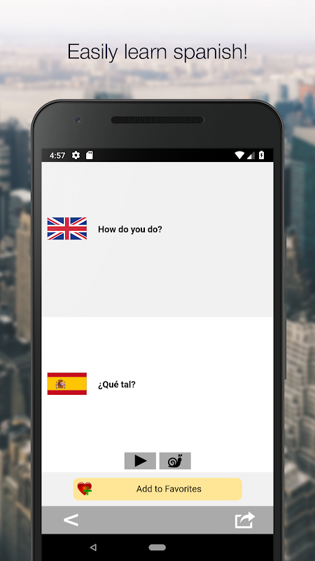 Would you like to learn the Spanish language easily and for free? Are you traveling to Puerto Rico, Argentina, Bolivia, Chile, Colombia, Costa Rica, Cuba, Dominican Republic, Ecuador, El Salvador, Equatorial Guinea, Guatemala, Honduras, Mexico, Nicaragua, Panama, Paraguay, Peru, Spain, Uruguay, and Venezuela? They all speak the Spanish language! Our Spanish offline translator, dictionary and talking phrasebook will be very useful! Easily learn the Spanish language for free: this app contains the most commonly used phrases in any Spanish-speaking country! Improve your Spanish pronunciation: every phrase has the audio pronunciation available, spoken by a mother tongue person! Travel airily in Spain: with 1300 phrases, you will be easily understood during your stay!