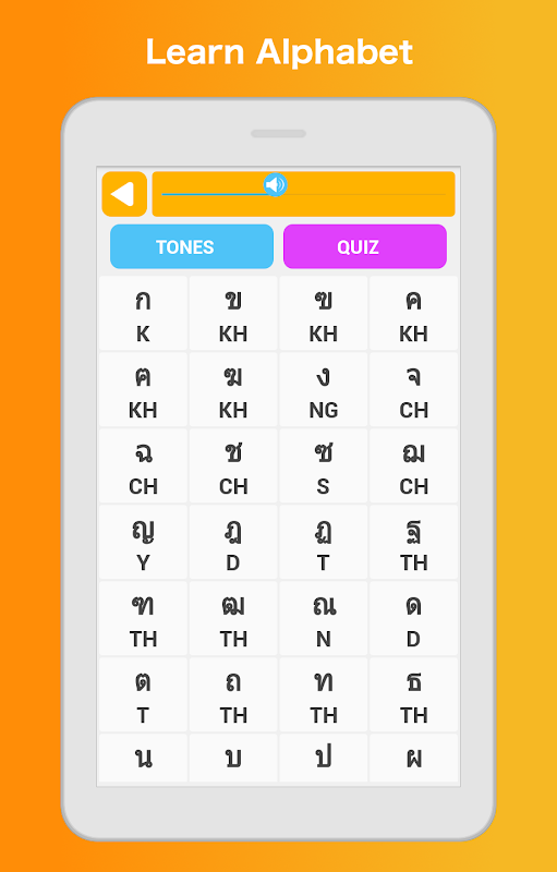 Anda boleh belajar mengenali dan membaca aksara Thai, dan sebutan dalam Bahagian Abjad aplikasi ini.