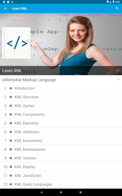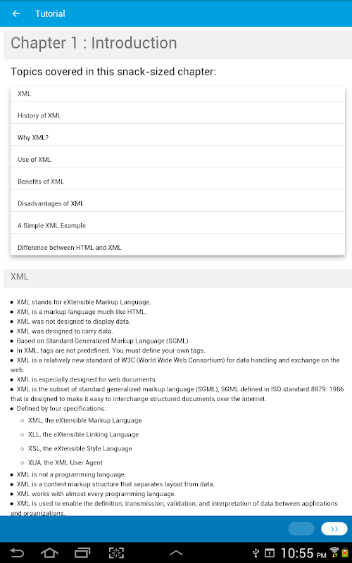 Anda mempunyai akses terhad ke kandungan yang disediakan. Untuk akses penuh ke kandungan, sila log masuk dan beli aplikasi ini. Aplikasi ini memberikan ringkasan ringkas konsep penting dalam XML dengan mengikuti bab berukuran makanan ringan: