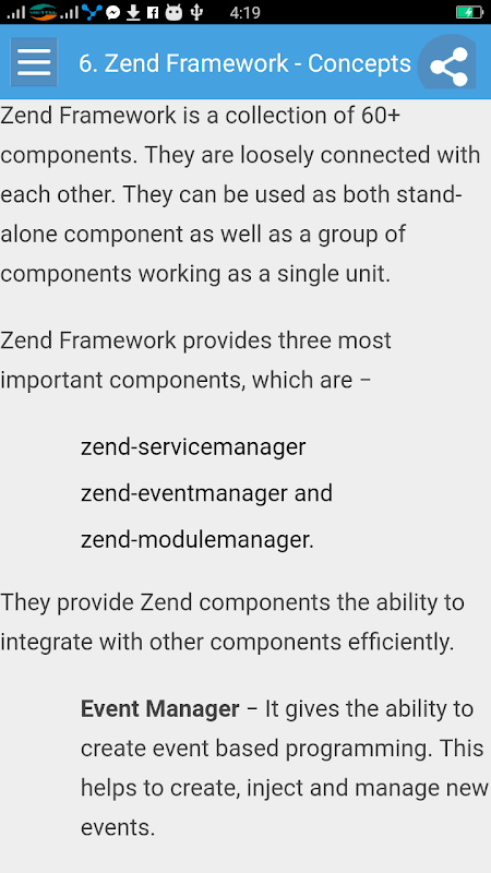 Before proceeding with the various types of components given in this Learn Zend Framework Full, it is being assumed that the readers are already aware about what a Framework is. In addition to this, it will also be very helpful if you have sound knowledge on HTML, PHP and the OOPS concepts.