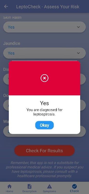 Pemeriksa Gejala Komprehensif: Pengguna boleh memasukkan simptom mereka, dan Lepto Check akan menilai kemungkinan leptospirosis, memberikan cadangan untuk tindakan lanjut atau perundingan perubatan.