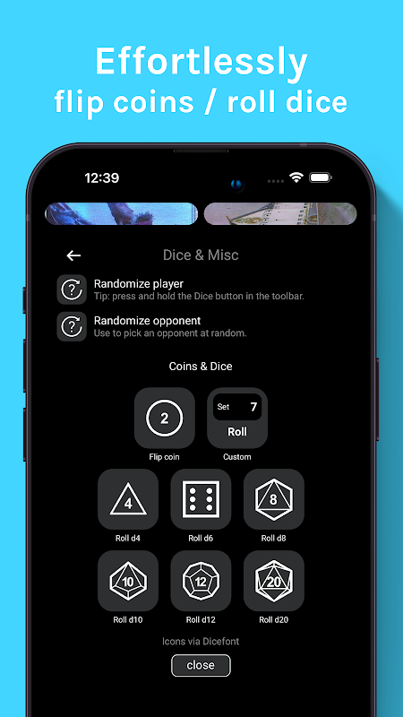 - Penggelek dadu yang boleh memilih pemain, lawan dan membaling satu daripada banyak dadu secara rawak - atau membalikkan syiling
