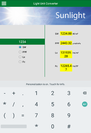 Aplikasi Light Unit Converter dari Apogee Instrumen mengira penukaran antara unit cahaya yang berbeza untuk pelbagai sumber cahaya termasuk lampu T5 Sylvania pendarfluor, logam halida, natrium tekanan tinggi, dan cahaya matahari. Unit termasuk radiasi gelombang pendek (SW), fotosintesis foton fluks (PPF, PPFD), Lux (lx) dan Kaki-lilin (fc, lm / ka2, atau kaki-c).