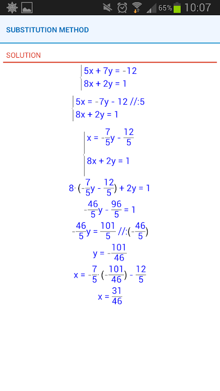 The application solves systems of equations with two or three unknowns. Each solution step by step showing what action has been taken to achieve a result.
