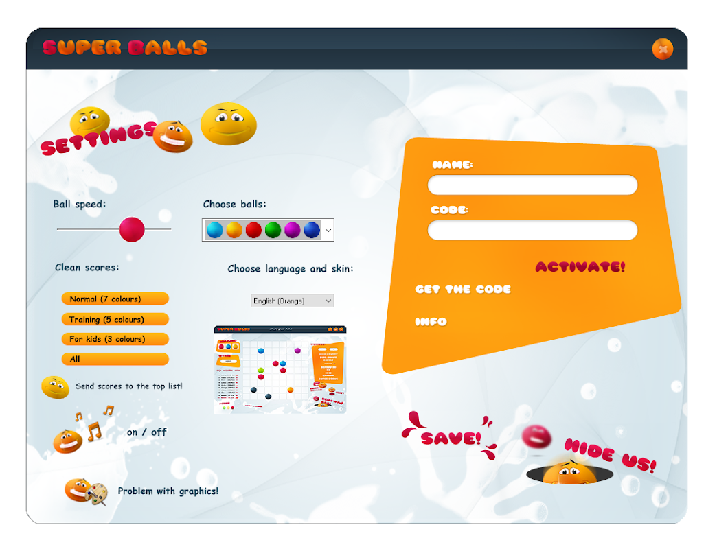 DELETE - hilang nombor tetap bola (dipaparkan dalam tetingkap kecil) warna dipilih secara rawak di sisi, atas dan bawah. Beberapa bola dalam tetingkap ini meningkatkan selama 6 bola dalam satu baris.