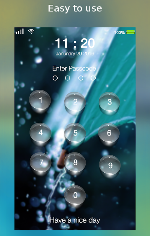 It has beautiful keypad with many water droplets. The keypad like keypad in lock screen of ios (iphone, ipad). You can change color and size of time, date. You can change background of lock screen. You will have your own attractive lock screen.