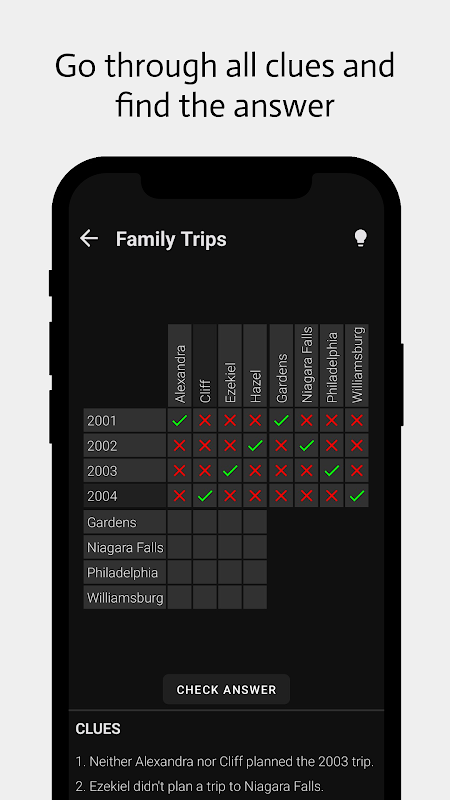 A custom-labeled grid is provided for every puzzle. The grid allows you to cross-reference every possible option in every category.