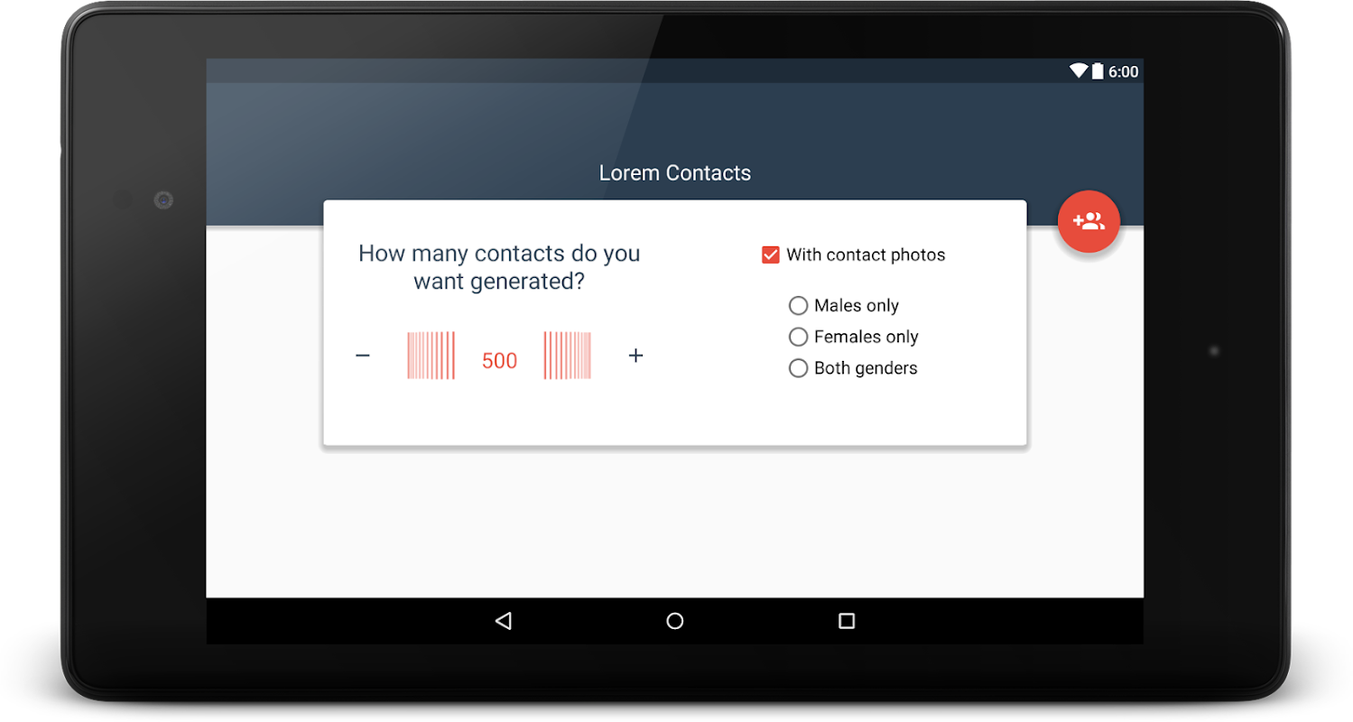 Adakah anda pernah mendapati diri anda memerlukan beberapa kenalan yang dijana secara rawak ?! Mungkin tidak. Tetapi kami mengambil keputusan untuk membina aplikasi ini juga. Ia opensource, benar-benar bebas iklan dan disesuaikan sepenuhnya kepada semua keperluan hubungan menjana asas anda. Untuk meletakkan ia hanya ... ia memenuhi senarai kenalan peranti anda dengan orang khayalan (dengan gambar!) Yang anda tidak tahu.