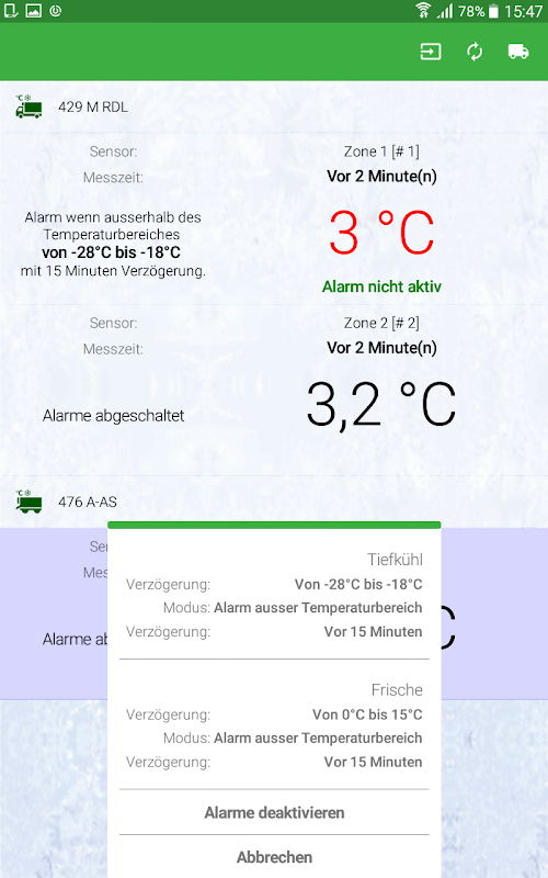Permohonan ini bertujuan untuk digunakan dengan penyelesaian pemantauan suhu peti sejuk LOSTnFOND®. Ia membolehkan untuk memantau cekap suhu peti sejuk setiap kenderaan dalam armada anda. Dalam suhu kenderaan Selain ambang amaran boleh ditakrifkan untuk setiap sensor suhu secara berasingan.