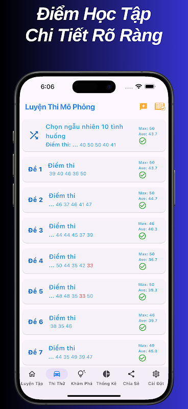 - Statistik terperinci tentang bilangan mata yang telah dicapai oleh pelajar semasa proses pembelajaran mengikut setiap situasi, dan setiap set soalan. Dari situ, ia membantu pelajar mengetahui bahagian mana yang telah mencapai kemahiran yang baik, dan bahagian mana yang belum dicapai supaya mereka boleh mempunyai rancangan untuk meningkatkan ulasan mereka.