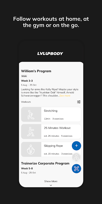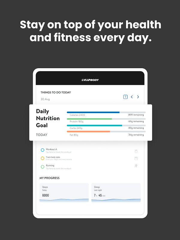 Dengan Apl Badan Naik Tahap, anda akan mempunyai akses kepada program senaman yang direka khusus untuk membantu anda mencapai matlamat kecergasan dan kesihatan anda. Anda boleh mengikuti & menjejaki senaman anda, pemakanan anda, tabiat gaya hidup anda, ukuran dan hasil–semuanya dengan bantuan jurulatih anda.