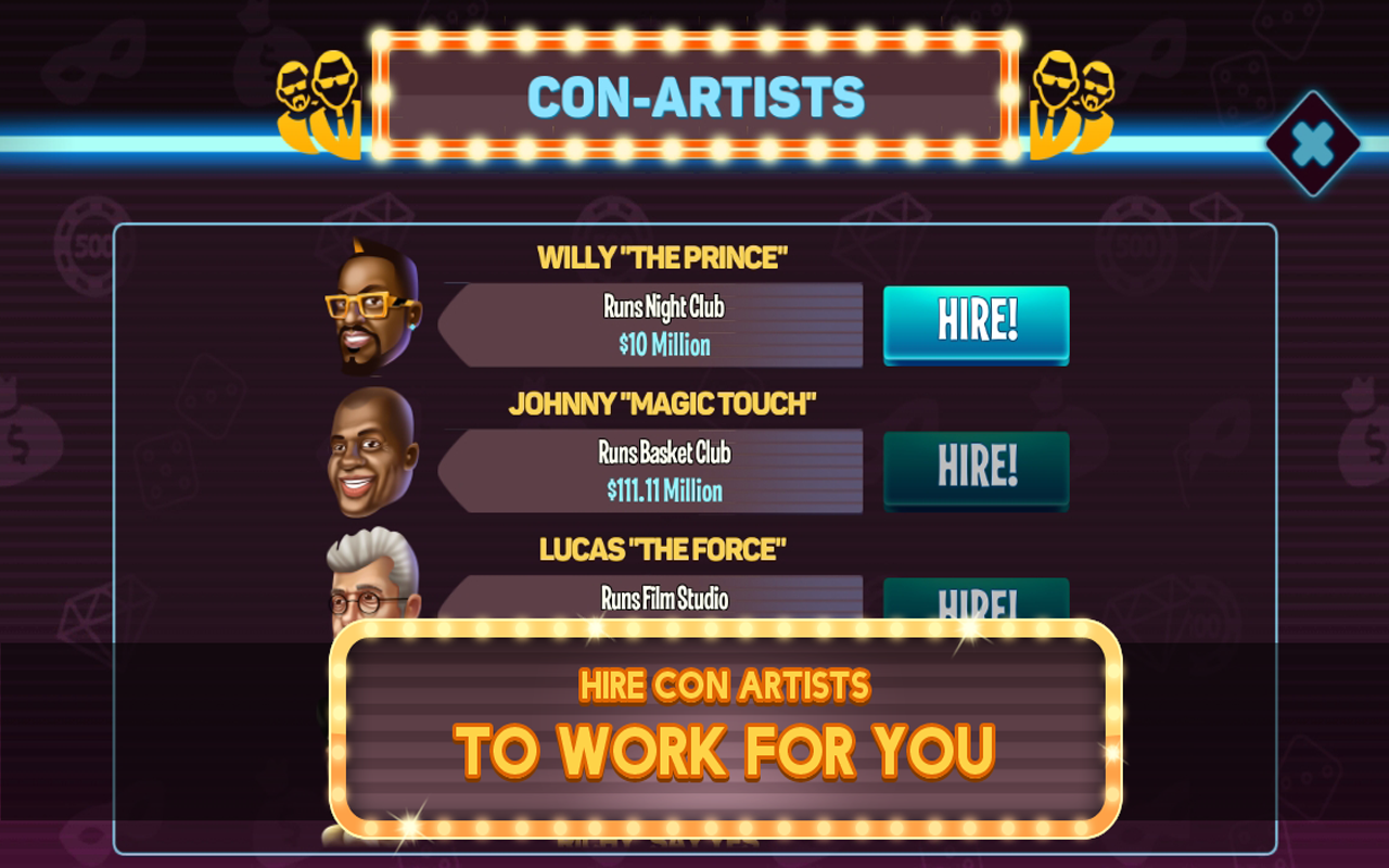You’ll own casinos, resorts, islands... you name it. Hire helpful Con Artists to run your underworld operations and upgrade your businesses to max out your revenues. Just keep taping to make more money!