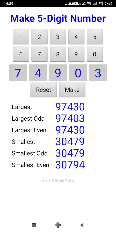 Berdasarkan input lima digit, aplikasi menunjukkan yang terkecil, yang terbesar, ganjil terkecil, ganjil yang paling besar, yang terkecil walaupun, nombor yang paling besar yang dibuat dari lima digit.