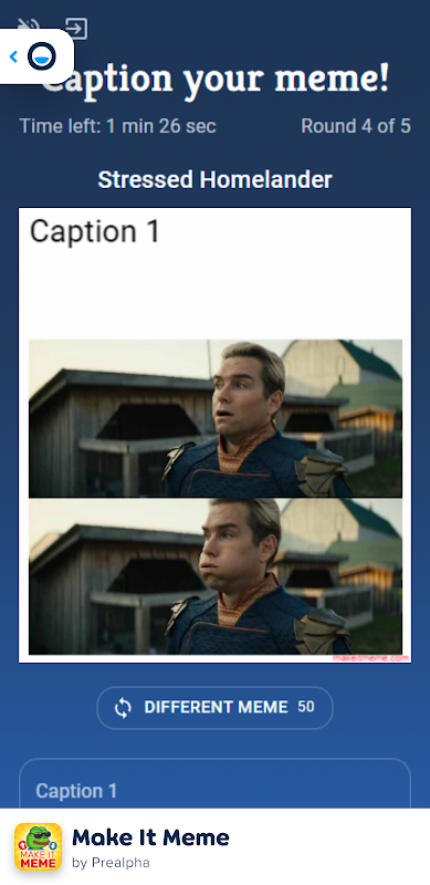 Make It Meme ialah permainan lucu di mana anda mencipta dan menjaringkan meme dengan rakan atau pemain sebenar anda dalam talian. Cukup buat atau sertai lobi dan tunggu pemain lain untuk menyertai. Sebaik sahaja permainan bermula, setiap pemain mendapat meme rawak dan perlu menghasilkan kapsyen lucu dalam masa yang diberikan. Setiap pemain kemudian mempunyai 15 saat untuk menilai ciptaan meme ini. Akhirnya, meme yang mendapat mata terbanyak memenangi pusingan itu. Terdapat 3 mod permainan untuk dipilih: Normal, Meme Sama dan Santai. Pilih mod yang anda kuasai dan tunjukkan kepada semua orang sisi lucu anda! Jangan lupa muat turun meme kegemaran anda dan kongsikannya dengan rakan-rakan anda!