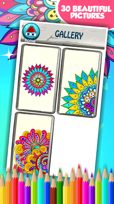 Treat yourself with the best drawings and download free the latest Mandala Coloring Book app on your phone. You will be enchanted with the magnificent geometrical patterns forming a circle. It symbolically represents the cosmos. Do not hesitate but use your imagination and click the paint bucket to fill the gaps of this wonderful top drawing that reminds you of a flower. Make the best photo and use it to decorate your tablet. Have you ever wanted to escape the gloomy reality and escape to some universe where you will enjoy every day without tension and obligations? While you work on the amazing sketches you will feel much better because you will be focused on amazing shapes that you are painting and there will be no space for anything else in your mind. This coolest game is intended both for children and adults so enjoy. There is no reason not to get the popular mandala coloring application and it will also surprise you with magnificent illustrations.