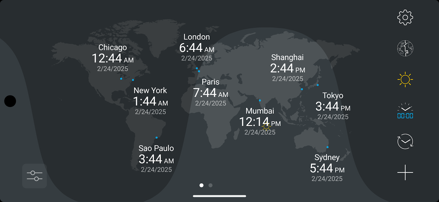 map:clock membolehkan anda menjejaki masa semasa untuk bandar utama dan zon waktu pada peta dunia.