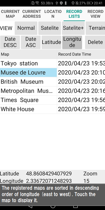 3. Record lists is a database of registered maps. You can sort by registration date and time in descending and ascending order, latitude descending order (north to south), and longitude descending order (east to west). If you touch normal, satellite, satellite +, or terrain, the map registered in the database will be displayed.