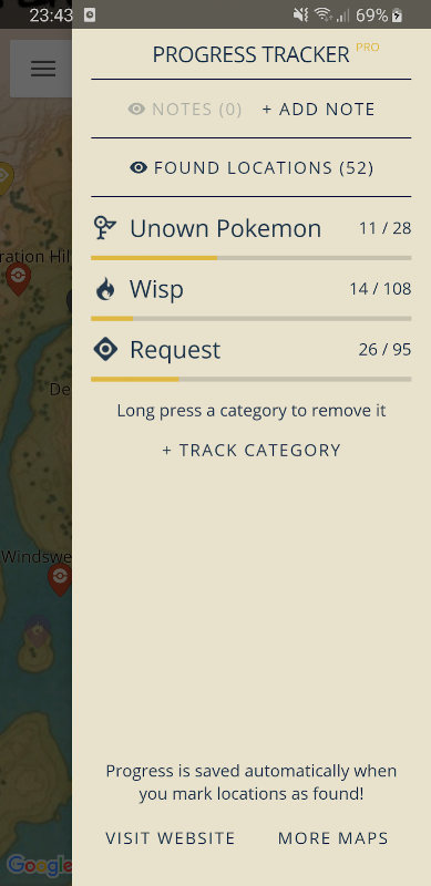 • Penjejak Kemajuan - tandakan lokasi sebagai ditemui dan jejaki kemajuan barang koleksi anda.