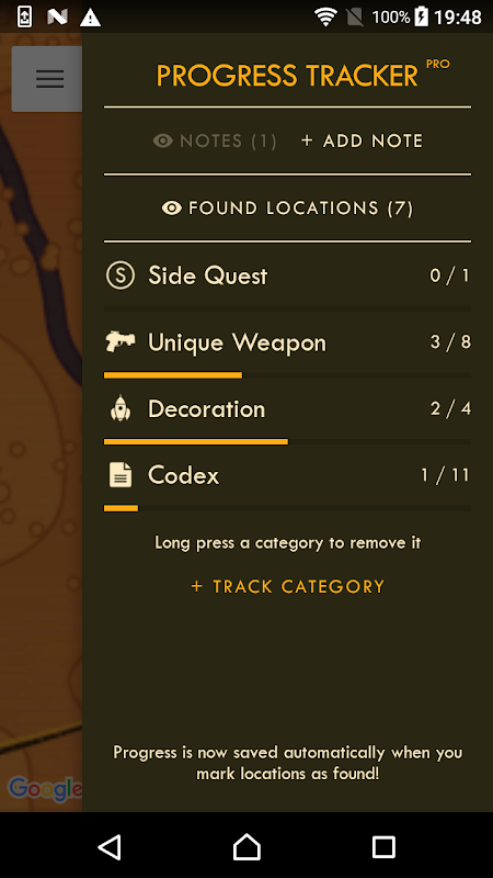 • Tracker Kemajuan - menandakan lokasi seperti yang dijumpai dan menjejaki kemajuan koleksi anda.