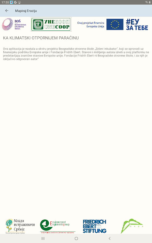 Ova aplikacija je nastala u okviru projekta Beogradske otvorene škole „Zeleni inkubator“, koji se sprovodi uz finansijsku podršku Evropske unije i Fondacije Fridrih Ebert. Stavovi i mišljenja autora izneti u ovoj platformu ne predstavljaju zvanične stavove Evropske unije, Fondacije Fridrih Ebert ni Beogradske otvorene škole, i za njih je isključivo odgovoran autor”