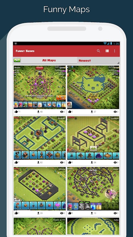 "Maps for Clash of Clans" is an Online app that contains New Base Maps of Clash of Clans VILLAGE and BUILDER BASE from :