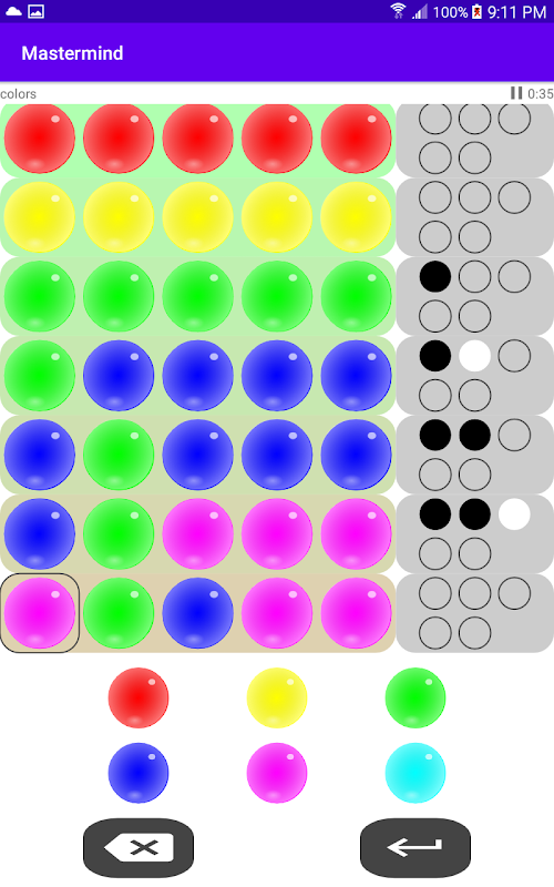 Di sebelah kanan setiap tekaan adalah tempat untuk pasak jawapan. Jika pasak berwarna hitam, ini bermakna salah satu warna, nombor atau huruf berada di tempat yang betul. Walau bagaimanapun, ia tidak menyatakan tempat yang betul. Jika pasak berwarna putih, ini bermakna salah satu warna, nombor atau huruf adalah betul tetapi di tempat yang salah. Sekali lagi, ia tidak menyatakan yang mana.