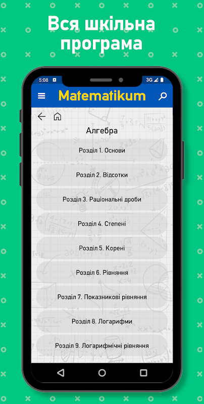 Aplikasi ini mengandungi lebih daripada 300 video pendidikan yang pendek dan padat serta lebih daripada 900 masalah untuk ujian kendiri dalam algebra, geometri dan trigonometri, disusun mengikut semua keperluan NMT, ZNO dan DPA.