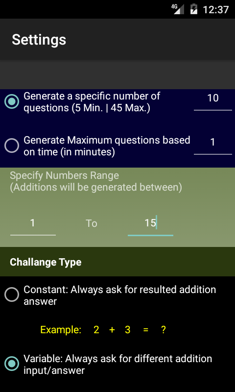 Tetapan lalai ditetapkan antara 1 hingga 15, ini bermaksud bahawa semua penambahan nombor matematik akan dihasilkan dengan angka antara 1 hingga 15. Semua tetapan dapat diubah dan disimpan di "layar Tetapan"