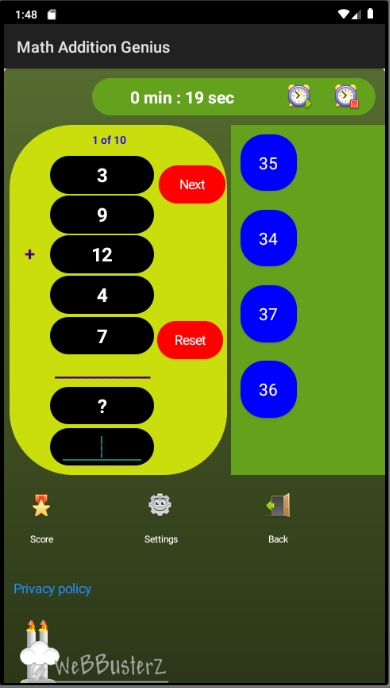 + Jawab sejumlah pertanyaan penambahan matematik (Angka dapat ditetapkan oleh pengguna di layar tetapan), aplikasi akan mendapat skor dan memberikan jumlah waktu yang diperlukan untuk menjawab semua pertanyaan
