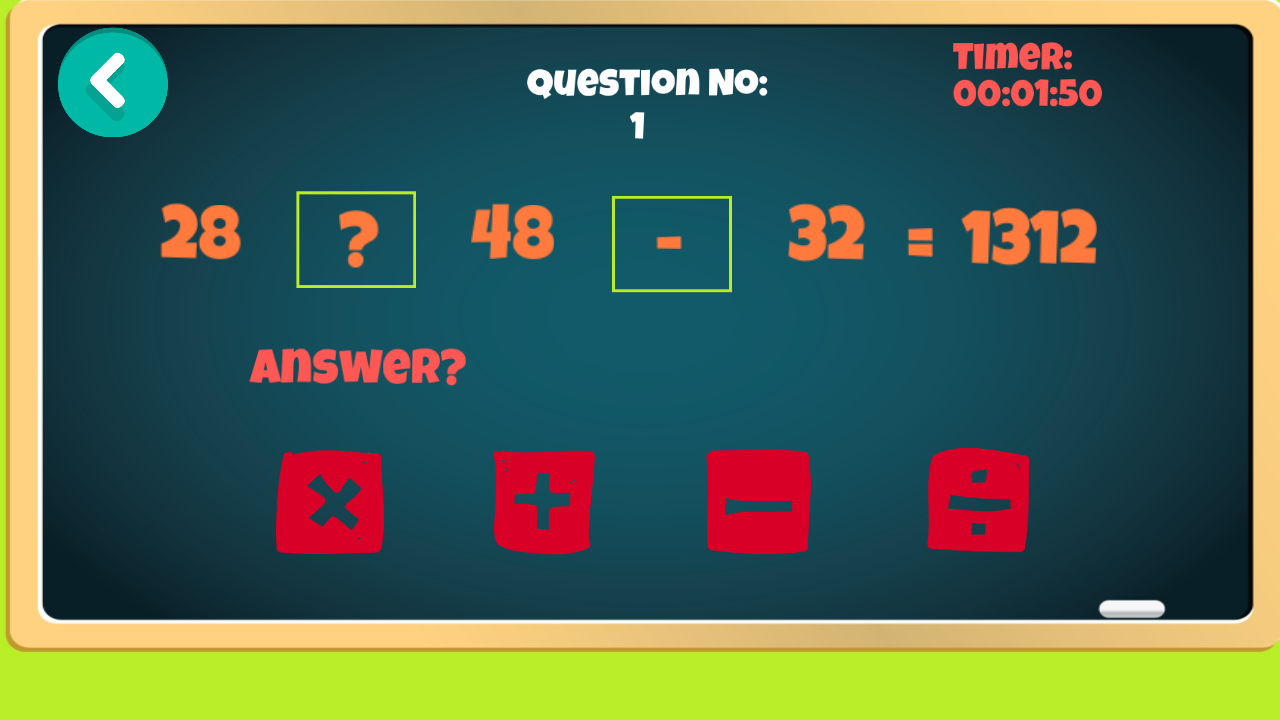 Choose the correct answer from either addition,subtraction,multiplication or division to solve the game. Get the right calculation by selecting the correct math operation.