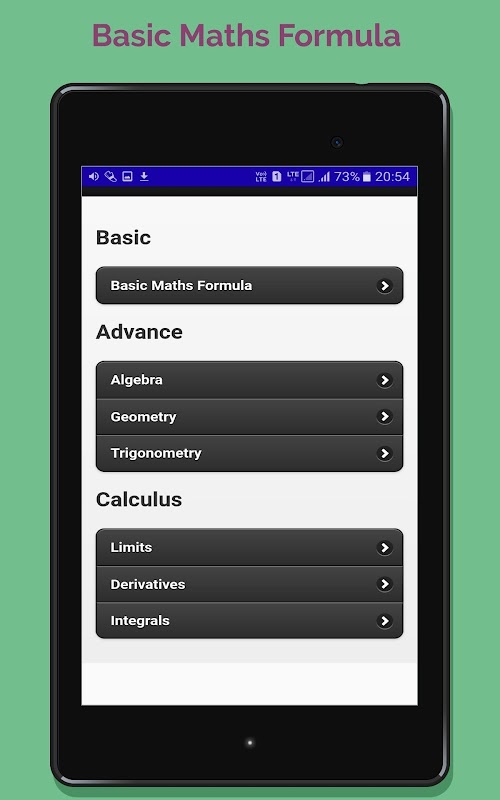 Remembering Math Formula is always an big task, Now no need to carry large books to find formula, This simple yet amazing apps for students, scientist, engineers as well as for analysts. Essential mathematics formulas apps just lists all the formula related to Integrals, Polynomials, Calculus, Algebra, Probability, Trigonometry, Limits, Geometry, Derivatives, and Logic. Almost cover all mathematics formulas.