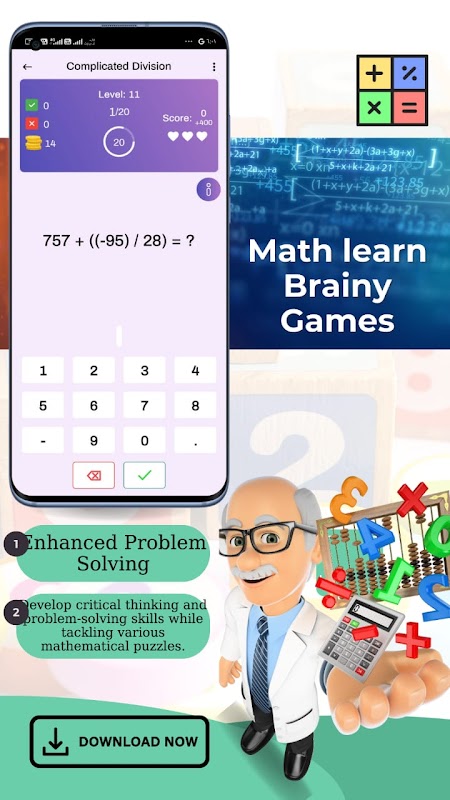 Enter the world of Math Mastery - Brainy Games, where learning mathematics becomes an enjoyable adventure! Whether you're a beginner or a math whiz, this app is designed to guide you from the basics to advanced levels. With over 36,000 diverse mathematical problems, including addition, subtraction, multiplication, division, square roots, cubic roots, and more, there's something for everyone. Suitable for children and adults alike, our app offers engaging gameplay that sharpens your mathematical skills while keeping you entertained for hours. With multi-language support and an intuitive interface, Math Mastery - Brainy Games is the perfect companion for anyone looking to enhance their math proficiency. Download now and embark on a journey to become a math master!