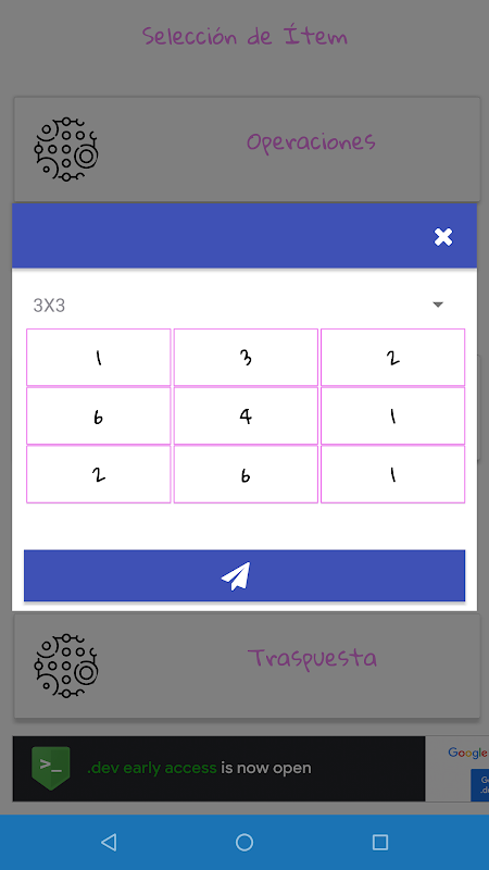 Dengan aplikasi yang menakjubkan ini, anda akan dapat mengetahui dan memperoleh hasil operasi asas dengan matriks 2x2, 3x3 dan 4x4, di samping anda boleh mengira penentu dan transposenya, apa yang anda harapkan? bahawa sebahagian yang tidak berhenti anda akan mempunyai 5 dalam aljabar linear