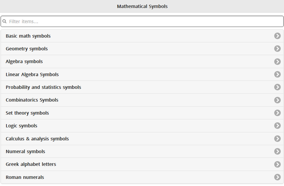 Matematik, Algebra, Geometri, Kalkulus, Alphabet, Kebarangkalian dan Statistik simbol untuk pelajar. Dalam aplikasi ini, anda akan mendapat ini maklumat matematik: