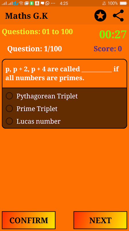 Dalam aplikasi ini anda akan mendapat lebih daripada 550 Matematik Soalan dan jawapan Dengan 3 pilihan, jika anda memilih jawapan yang betul maka skor akan dikira dan juga jawapan akan berada dalam warna Hijau dan baki 2 pilihan akan mendapat warna Merah. Ini adalah salah satu aplikasi terbaik untuk orang yang suka mempunyai pengetahuan Matematik.