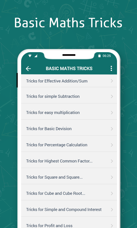 Trik matematik mengajar anda Trik Matematik Asas, Trik Vedic Matematik dan Trik Matematik Fun dan Logik. Ia juga termasuk latihan Matematik Permainan.