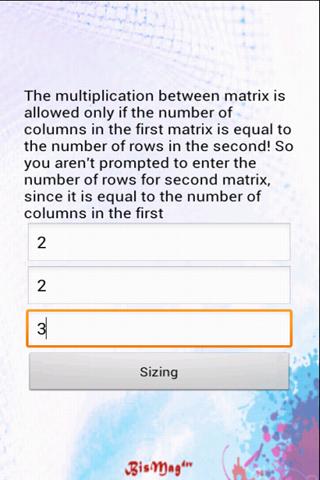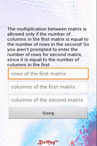 The use is intuitive, you have to size the matrices by entering the number of rows and columns, and then the values of the matrices, the app does the rest.