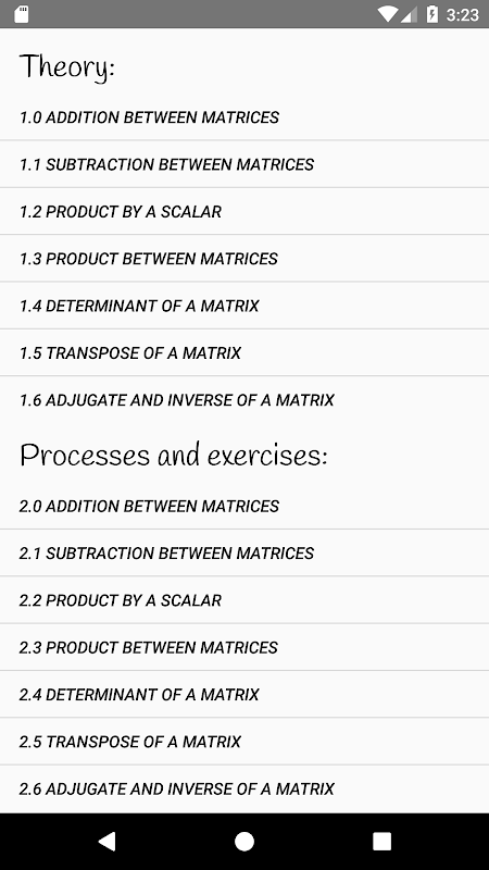 Ia adalah kalkulator matriks yang diprogramkan secara eksklusif untuk Android sehingga dapat melakukan pengiraan dengan lebih cepat dan cekap. Aplikasi ini mempunyai kemampuan untuk melakukan operasi berikut: