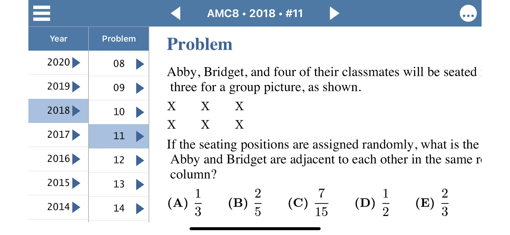 Aplikasi ini mengandungi semua masalah dan penyelesaian American Junior High School Mathematics Examination (AJHSME) dari 1985 hingga 1998. Tambahan pula, ia mengandungi semua masalah dan penyelesaian Pertandingan Matematik Amerika (AMC 8 untuk pelajar gred 8 dan ke bawah) dari 1999 hingga hari ini.