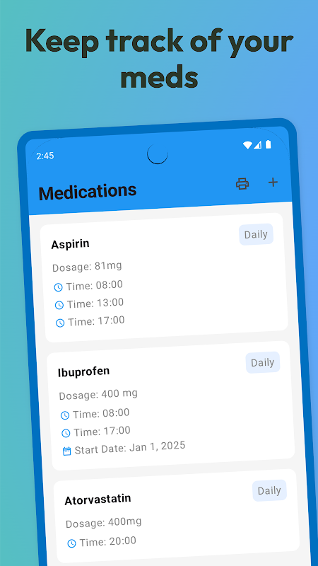 Penjadwalan Lanjutan: Perlu minum obat pada interval yang tidak teratur? Tidak masalah! Fitur penjadwalan lanjutan kami memungkinkan Anda mengelola pola dosis yang rumit dengan mudah.