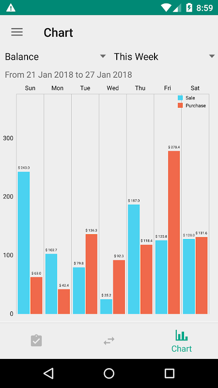 • Laporan urus niaga carta bar bersih jualan dan pembelian (mengikut minggu / bulan / julat adat)