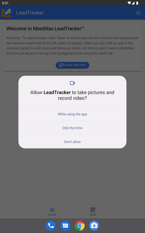 Selamat datang ke apl MeetMax LeadTracker, produk TWST Events. Aplikasi ini akan membolehkan anda menggunakan kamera telefon anda untuk mengimbas kod QR yang telah dijana pada lencana yang dicetak oleh perkhidmatan Lencana MeetMax.