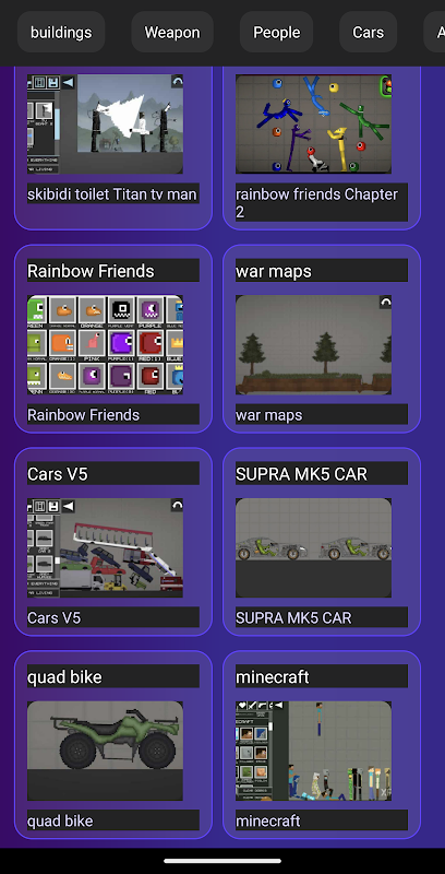 Anda boleh menemui semua mod popular, tandas skibidi , seperti Soccer, Doom Guy, SCP, VHS Sans, Undertale, Jotaru dan Star Platinum, Avatar, Artileri Moden, Mutants, Poppy playtime, Kraken, Lightsabers, Raptor, Bendy, Choo Choo Charles, Spider-Man dan banyak lagi.