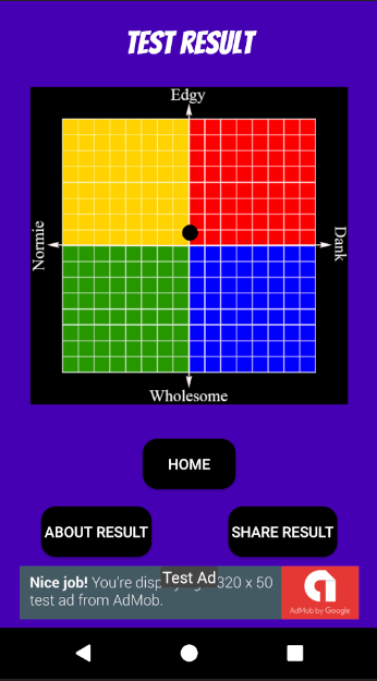 Aplikasi ini membantu anda untuk mengetahui jika anda suka dank, normie, Edgy atau memes sihat. Ia terdiri dalam satu set soalan dan setiap soalan mempunyai beberapa jawapan yang boleh anda pilih.