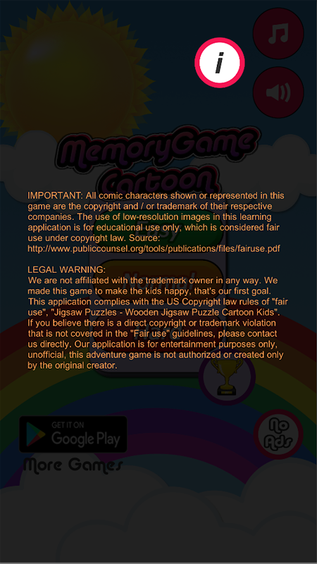 Aplikasi ini mematuhi peraturan undang-undang Hak Cipta AS mengenai "penggunaan adil", "Kartun Permainan Memori - Watak Kartun Comel".