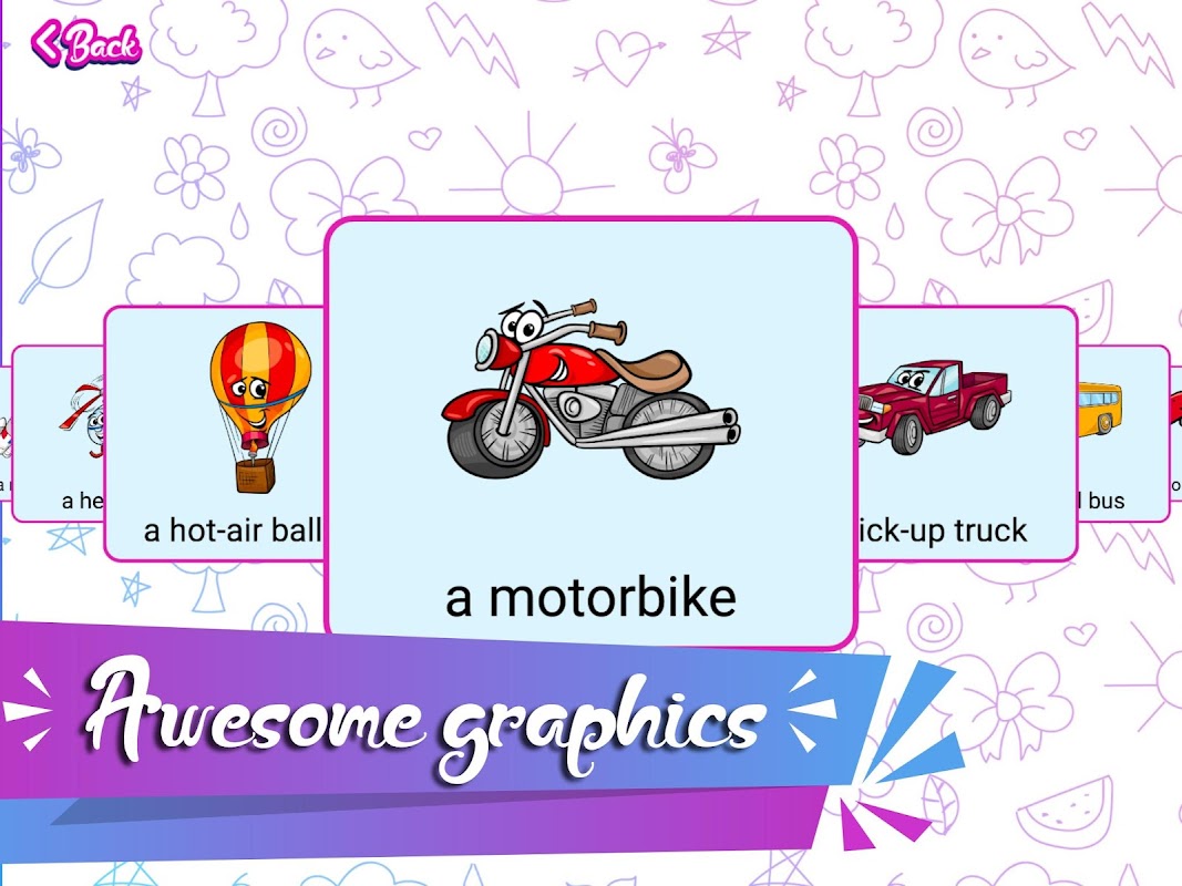 - The learn mode enter to a screen where your kids can access all the words on the theme one by one just by swiping left and right.
