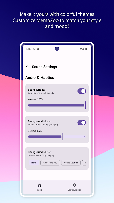 Jadikan permainan ini benar-benar milik anda! Peribadikan MemoZoo dengan tema visual yang bertenaga seperti Klasik, Lautan, Matahari Terbenam, Hutan dan banyak lagi. Tukar warna untuk dipadankan dengan mood anda.