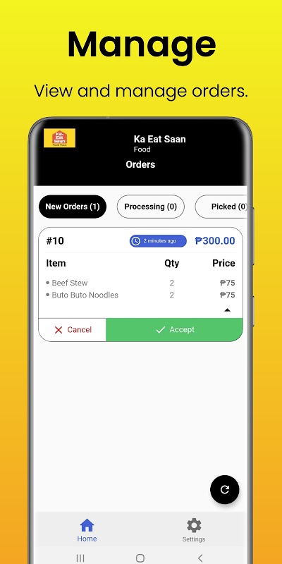 Urus dan pantau pesanan dari kedai anda dengan mudah.