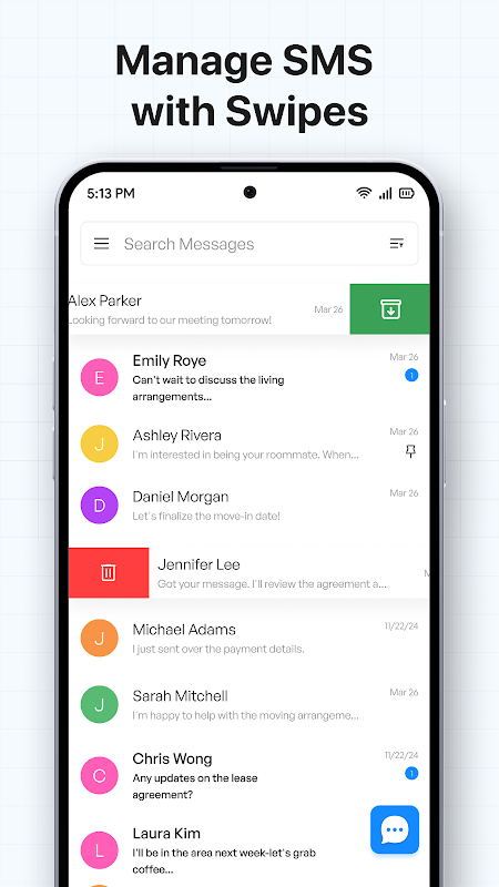 Streamline your workflow. Swipe on a conversation to quickly delete, call, block, archive, or mark as read/unread. A perfect time-saving tool for managing your SMS messages efficiently.