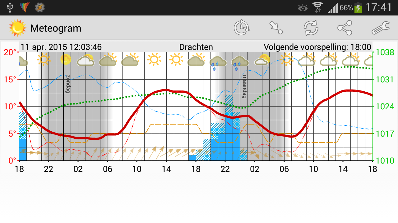 The meteogram app shows a graph of the weather prediction of the current or a predefined location. The graph contains: